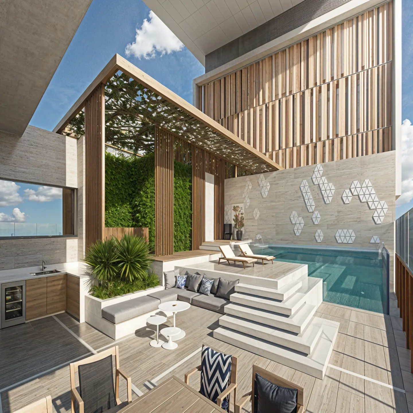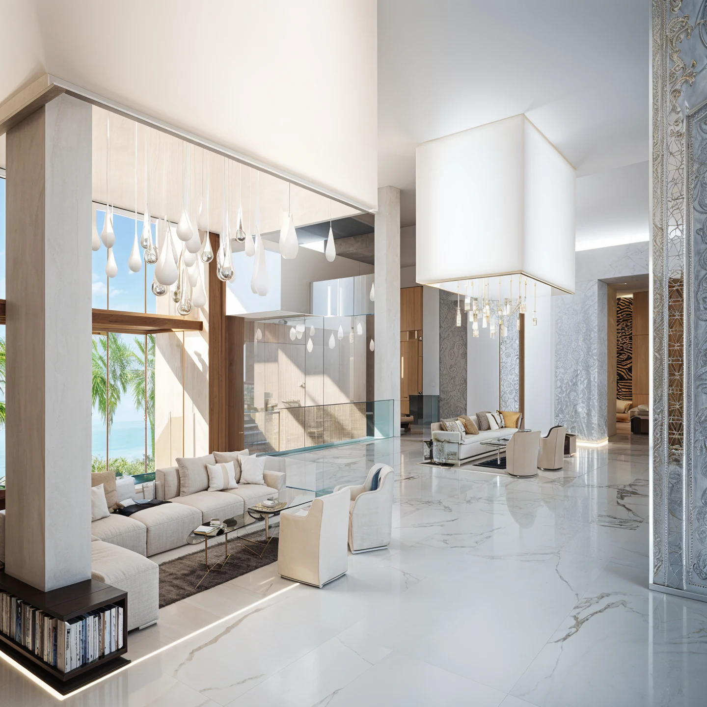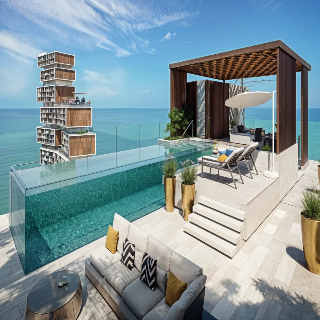 387 097 m² stacked‑block icon; SENSI glossy porcelain and mosaics elevate sky‑bridge terraces.