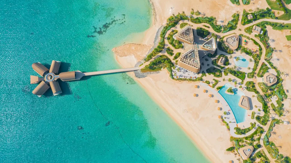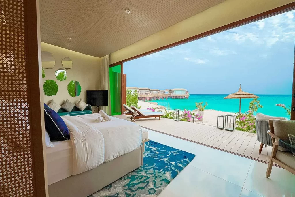 Five‑star escape on 5 000‑acre island; 31 beach and over‑water bungalows ring turquoise lagoons, reached by 40‑minute boat from El Gouna.